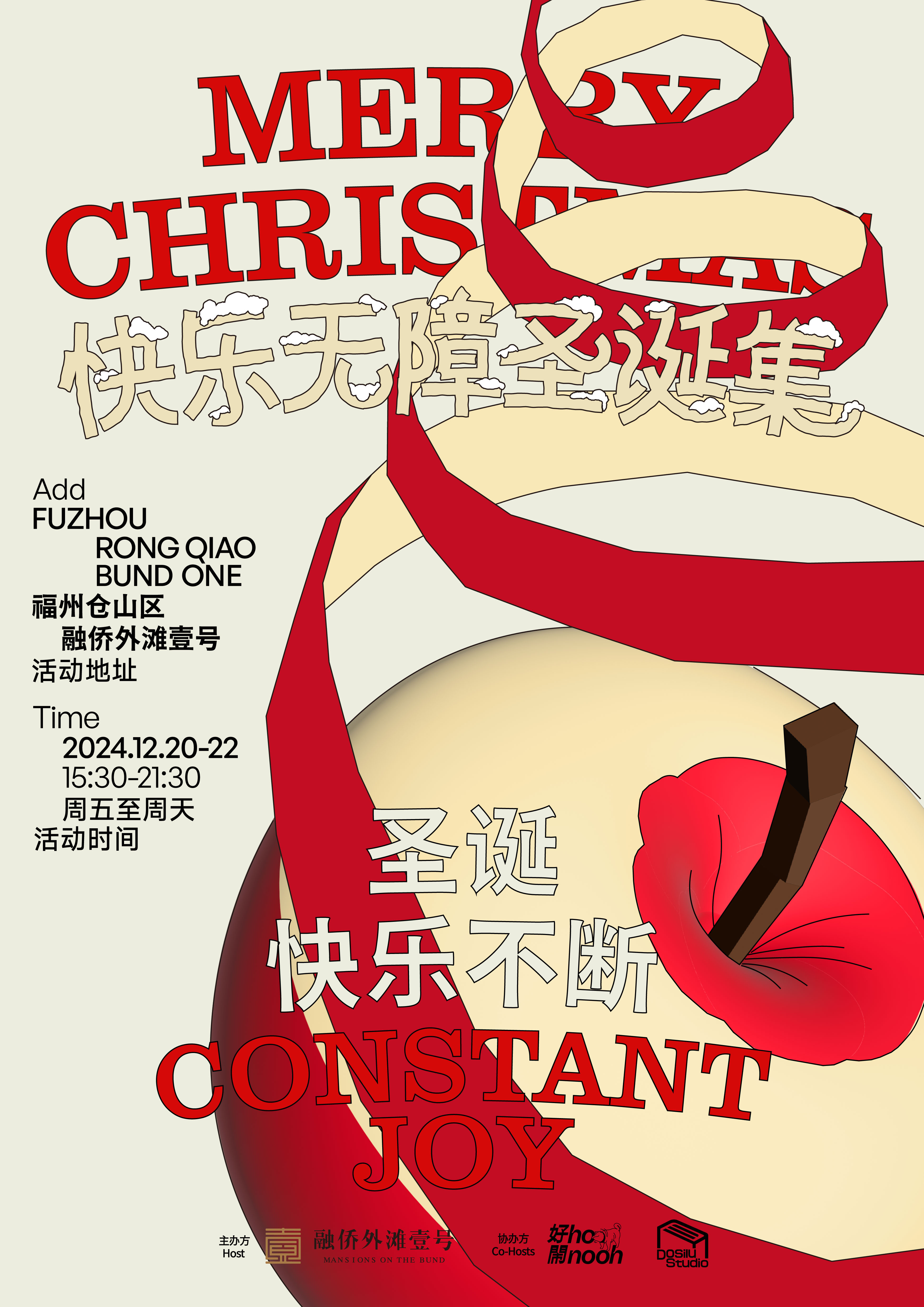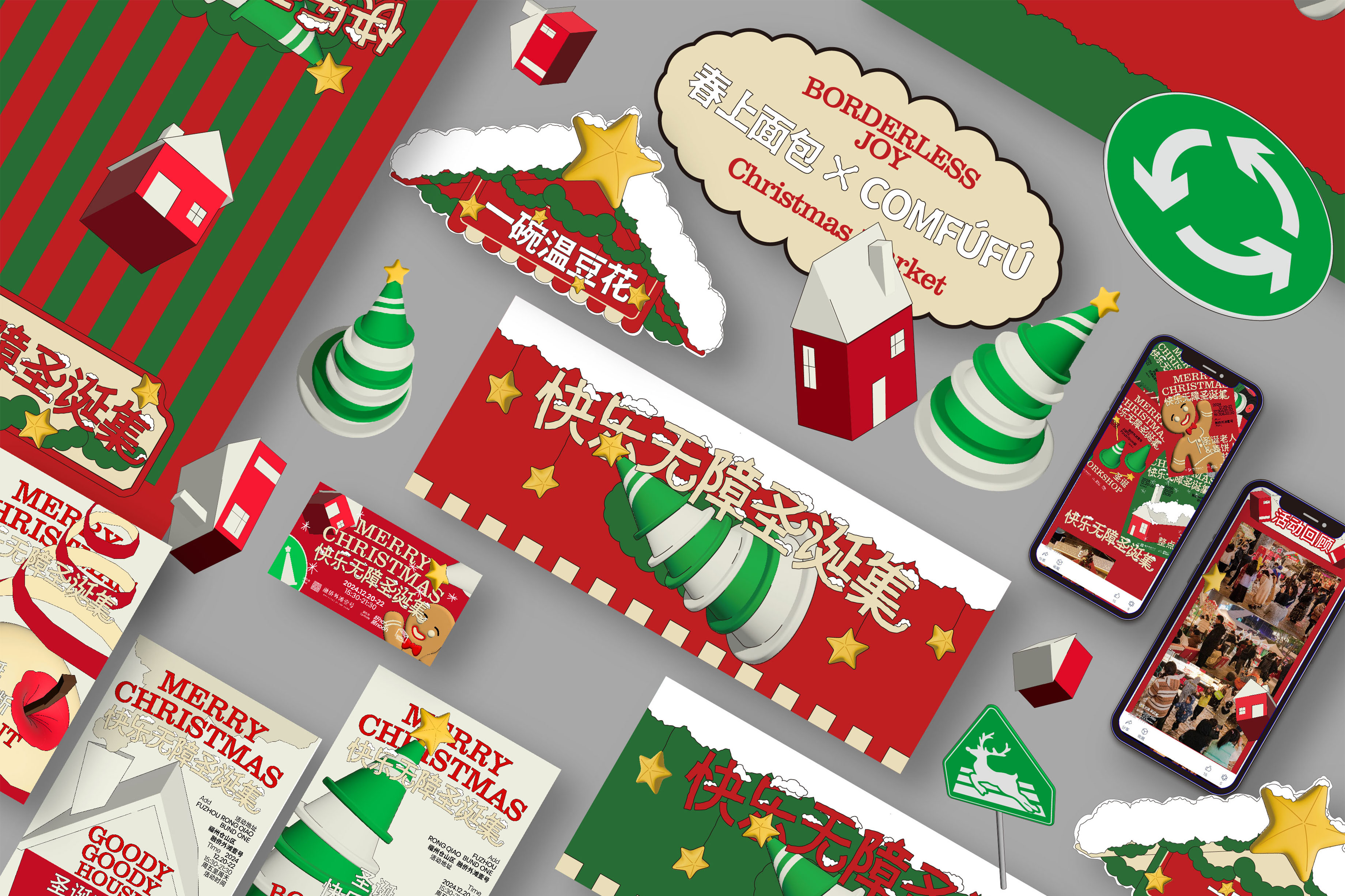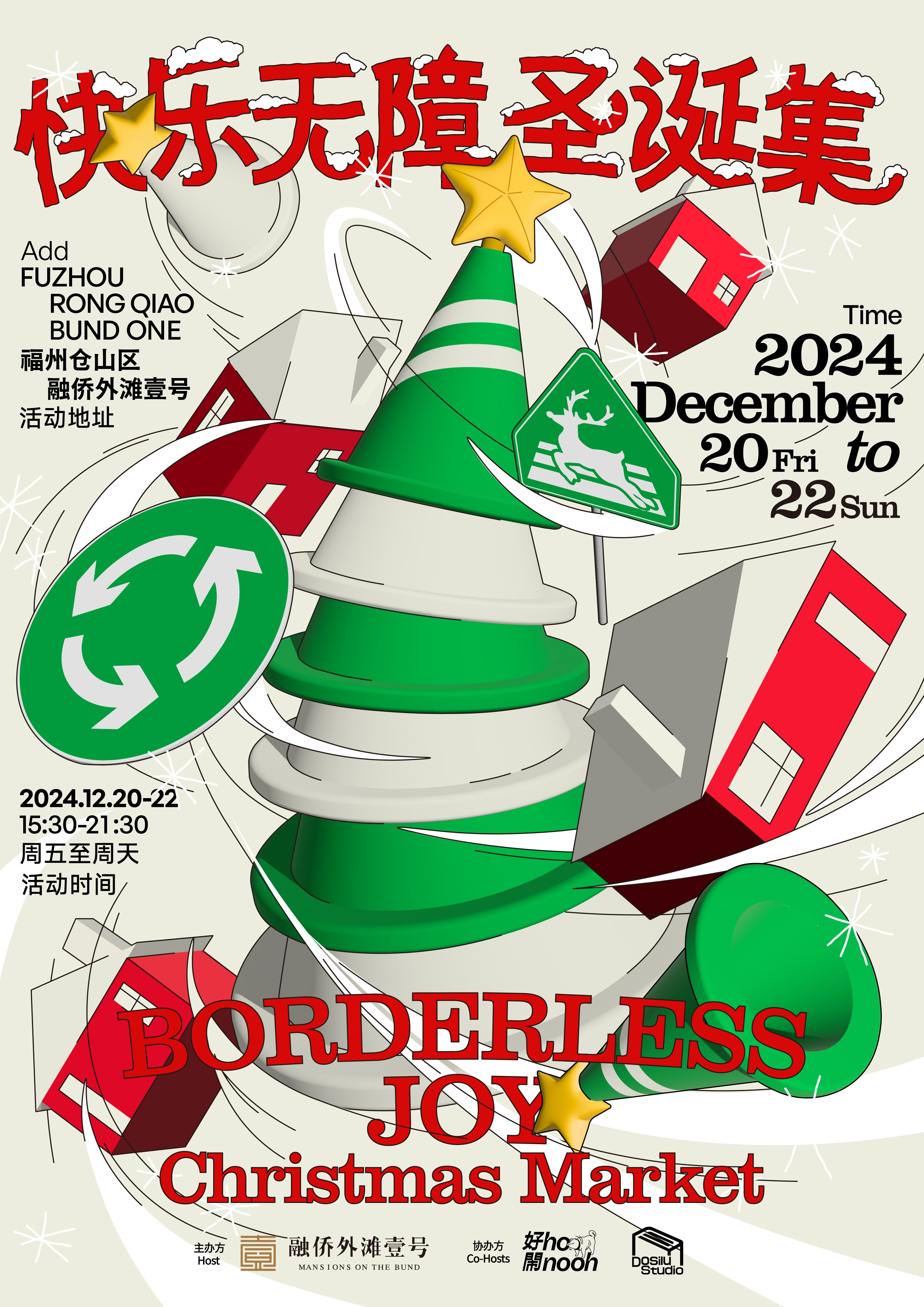 2024的圣诞市集,我们携手福州融侨外滩壹号,以“路障”为视觉核心,重塑节日的边界。路障原是阻隔的象征,而我们将扭曲的“阻隔”转化为视觉与空间的核心设计语言,重叠的路障组合成圣诞树,为语言添加语义。