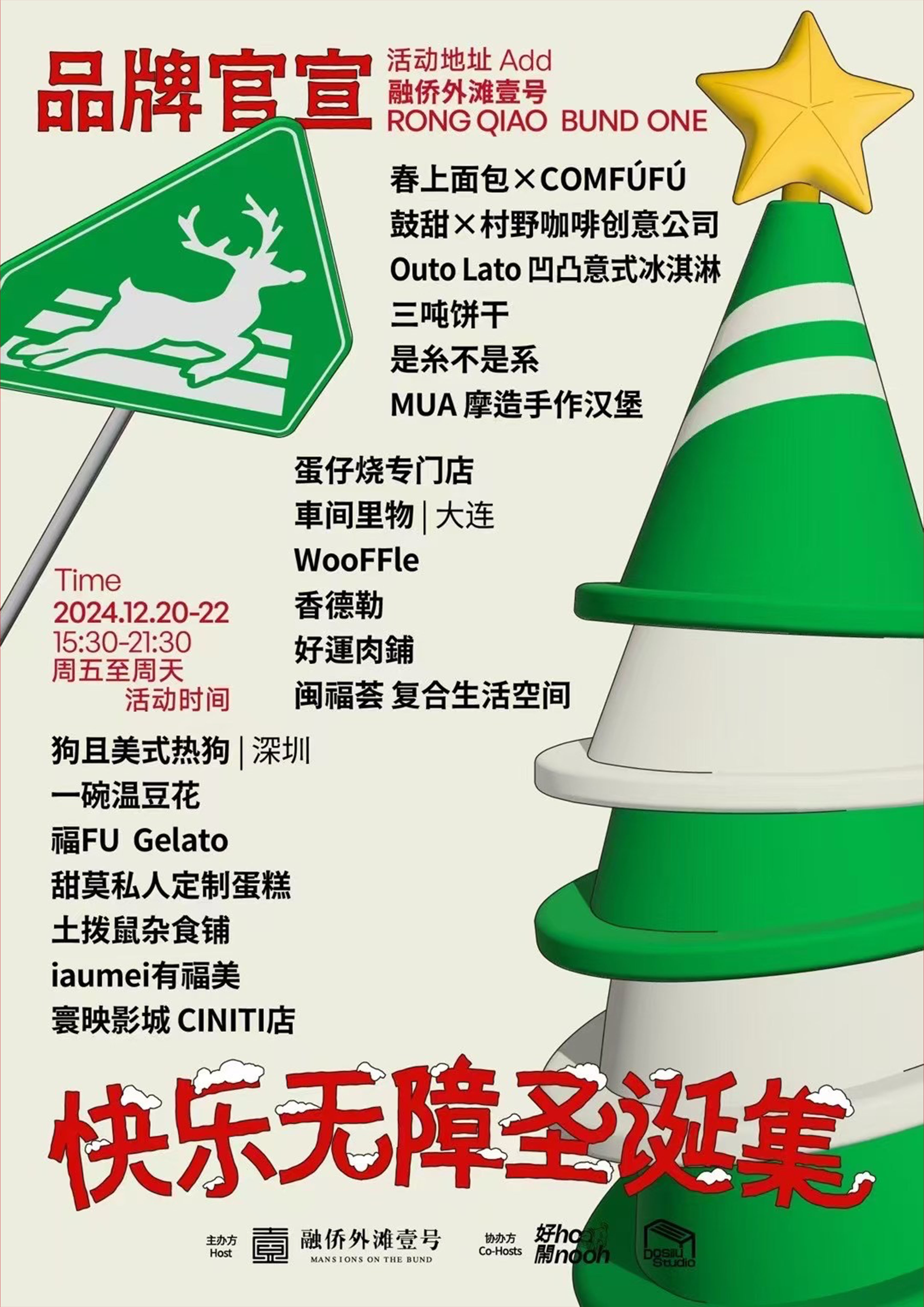2024的圣诞市集,我们携手福州融侨外滩壹号,以路障为视觉核心,重塑节日的边界。路障原是阻隔的象征,而我们将扭曲的阻隔转化为视觉与空间的核心设计语言,重叠的路障组合成圣诞树,为语言添加语义。