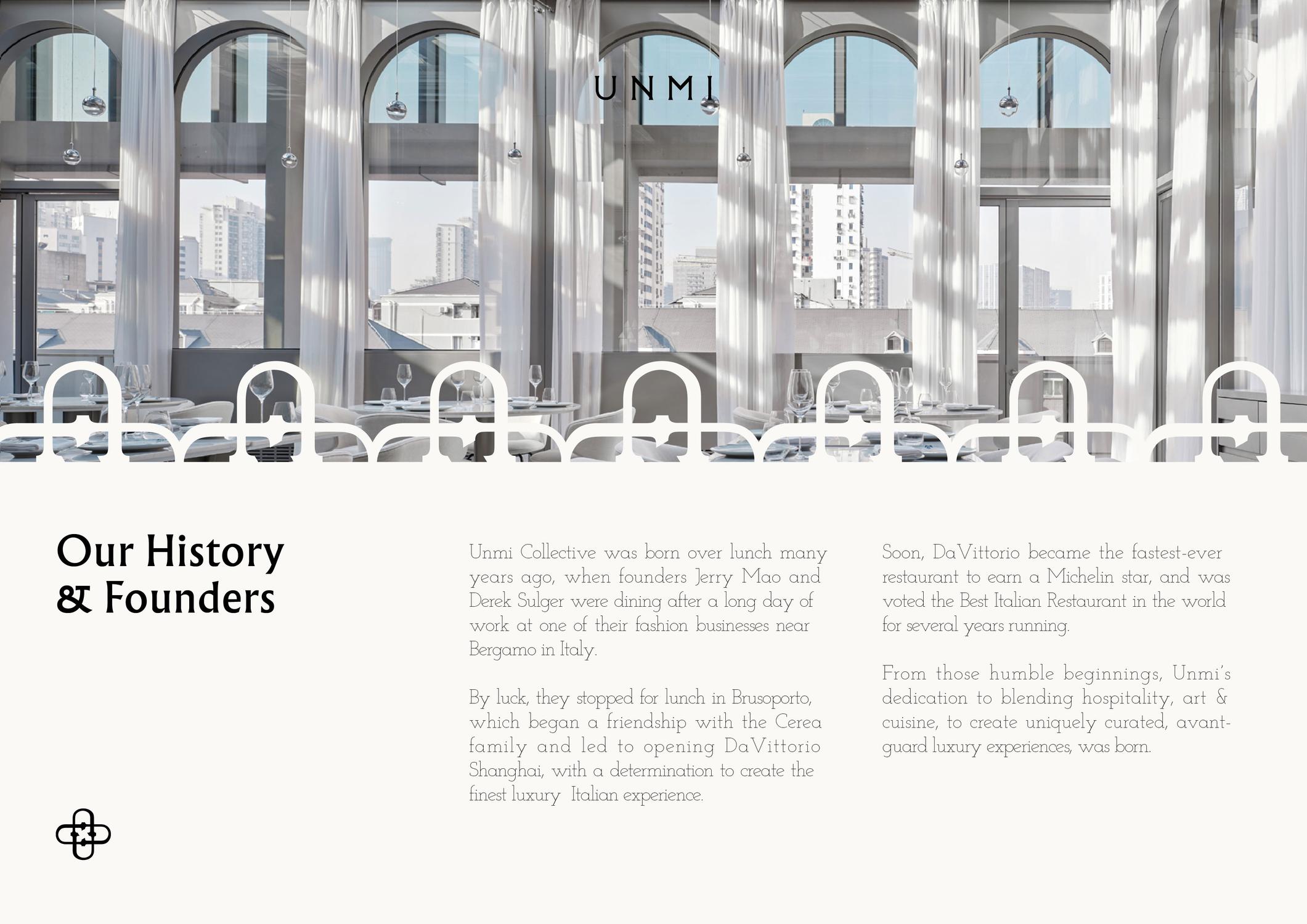 UNMI是一家将酒店、艺术和美食完美融合的餐饮管理集团,致力于为每一位到访宾客创造独特的奢华体验。公司专注于通过引入新的生活方式、文化和餐饮理念,重新定义中国消费者的美食体验。UNMI推动这一切的核心信念是,中国的千禧一代和Z世代正在通过真实而本土化的中国品牌,寻找一种能够体现新中国文化理念的独特个人身份。